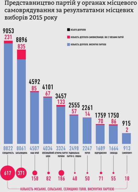 От Радикальной партии избраны 2555 депутатов, Укропа - 2261, Видродження - 1759, Свободы - 1750. От Самопомощи на прошедших выборах в органы местной власти прошли 915 депутатов.