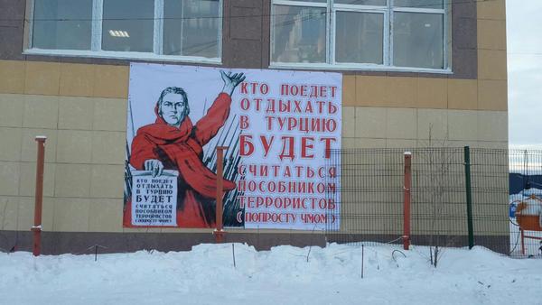 В Салехарде (Ямал, Россия) на фасаде торгового центра «Центральный-4» появился антитурецкий плакат. На нем изображена Родина-мать с самого известного пропагандистского плаката СССР и надпись: «Кто поедет отдыхать в Турцию будет считаться пособником террористов (попросту чмом)», сообщает Znak.com.