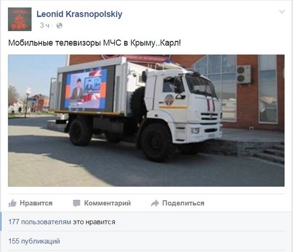 «Ведь нельзя же, чтобы люди вдруг начали думать своей головой. Поэтому российская пропаганда постаралась не оставлять людей без своего влияния, - делают вывод пользователи соцсетей. - Большие плазмы устанавливают на грузовиках с генераторами и вывозят на площади, показывая людям главные федеральные каналы российского ТВ с наибольшим количеством пропаганды».