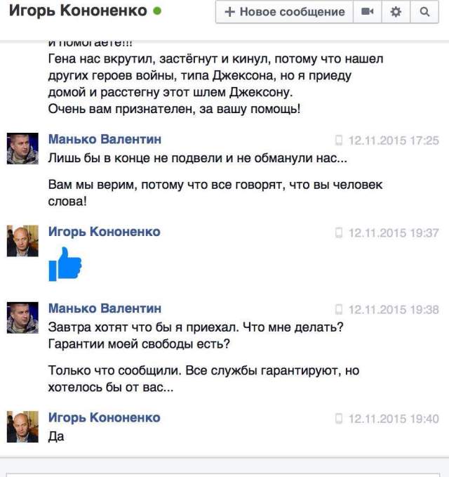 По данным партии, Манько действительно был снят с международного розыска в тот же день, когда он связался с первым заместителем председателя фракции партии «Блок Петра Порошенко» Игорем Кононенко в Facebook. Вскоре после этого Манько вернулся из-за границы в Украину и начал активно свидетельствовать против лидера «Укропа» Геннадия Корбана. «12 ноября, как раз во время переписки, Генеральная прокуратура Украины сняла господина Манько с розыска, и об этом сообщил Интерпол», - заявил Денисенко, назвав переписку Манько и Кононенко «сделкой с дьяволом».