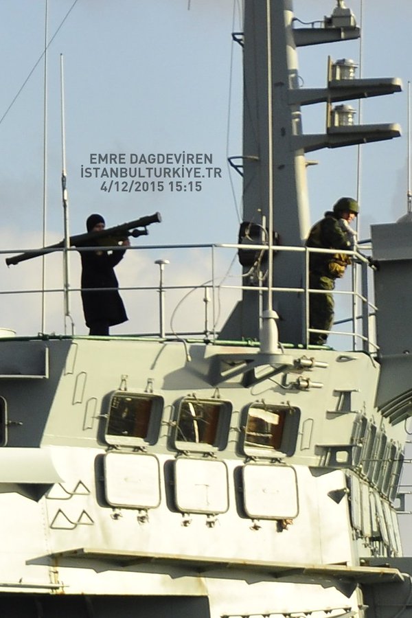 Снимки с российским кораблем, проходящим через Босфор 4 декабря, попали в социальные сети. На них при большом увеличении на мостике видно двух военных, один из которых держит на плече ПЗРК.