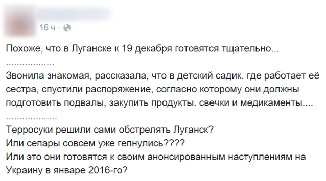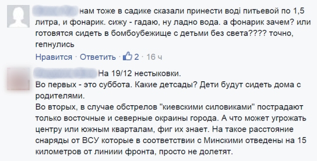 В комментариях к посту еще одна луганчанка написала, что в детском саду их попросили принести бутылку воды и фонарик.