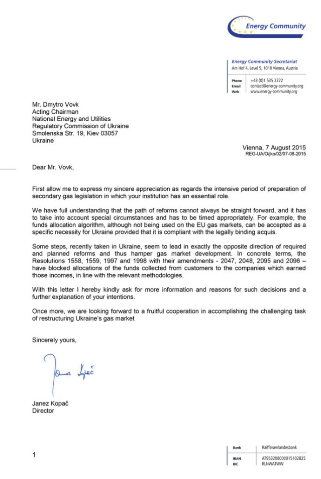 Директор «Европейского Энергетического Сообщества» Янез Копач в официальном письме к главе НКРЭКУ Дмитрию Вовку выразил озабоченность и попросил пояснить правовую обоснованность введения алгоритма распределения средств на газовом рынке.