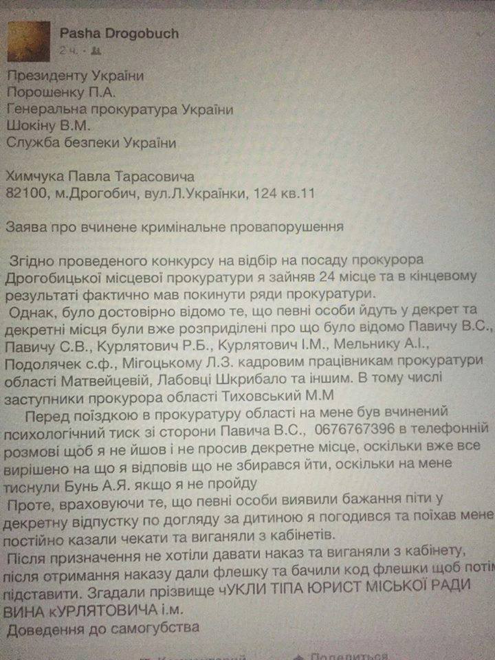 Химчук не прошел конкурс на должность в местную прокуратуру Дрогобыча, а когда появилась возможность пройти на декретное место, ему не дали такой возможности.