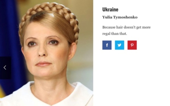 От Украины редакция издания выделила Тимошенко. А свой выбор в журнале аргументировали так: «Потому что ни одна другая прическа не может получить больше регалий, чем эта».