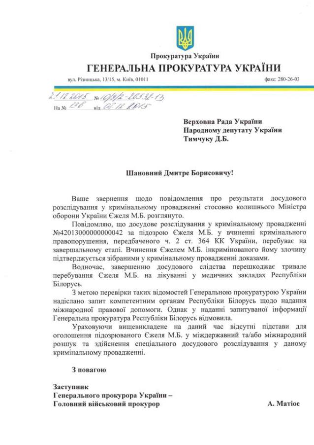 «Предоставляю ответ Генпрокуратуры Украины на мое обращение с просьбой дать пояснение, куда делся экс-министр обороны Украины М.Ежель, которого после долгой эпопеи сняли-таки с поста Посла Украины в Республике Беларусь», - написал нардеп на своей странице в Facebook.