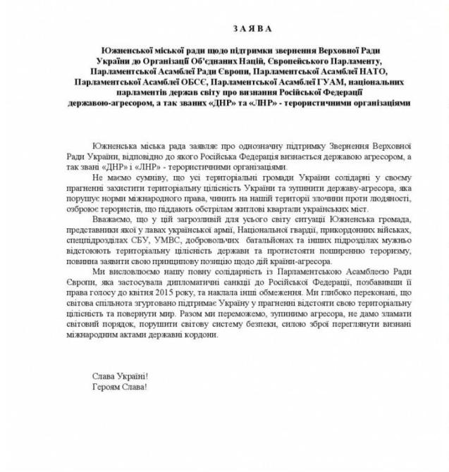 Южненский городской совет (Одесская область) поддержал обращение Верховной Рады к международным организациям о признании Российской Федерации страной-агрессором, а так называемых «ДНР» и «ЛНР» - террористическими организациями.