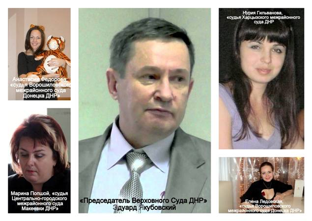 «Елена Ледовская, 1986 года рождения, «судья Ворошиловского межрайонного суда Донецка ДНР», ранее работала помощником судьи в Апелляционном суде Донецкой области. Анастасия Федорова, 1989 года рождения, «судья Ворошиловского межрайонного суда Донецка ДНР», ранее работала помощником судьи в Апелляционном суде Донецкой области. Елена Богословская, 1976 года рождения, «судья Центрально-городского межрайонного суда Макеевки ДНР». Марина Попшой, 1969 года рождения, «судья Центрально-городского межрайонного суда Макеевки ДНР», ранее, с 1995 года работала судьей в этом же суде. В 2000 году была избрана Верховной Радой Украины бессрочно судьей в этот суд. Нурия Гильванова, 1982 года рождения, «судья Харцызского межрайонного суда ДНР». Виталий Валуйский, 1989 года рождения, «судья Буденновского межрайонного суда Донецка ДНР», - сообщил Аброськин.