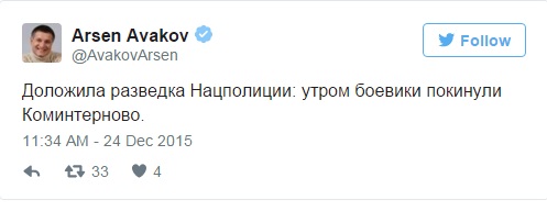 Министр внутренних дел Арсен Аваков заявил, что боевики покинули Коминтерново. Об этом он написал в своем Twitter со ссылкой на разведку Нацполиции.