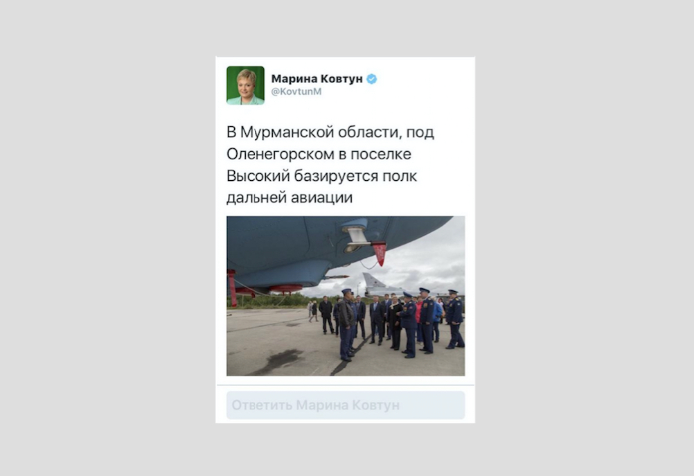 На этом поздравление губернатора не закончилось. Ковтун решила напомнить, что «свою боеготовность дальняя авиация подтвердила и в ходе воздушной операции в Сирии». За этим сообщением последовала публикация фотографии секретного аэродрома с подписью: «В Мурманской области, под Оленегорском в поселке Высокий базируется полк дальней авиации».