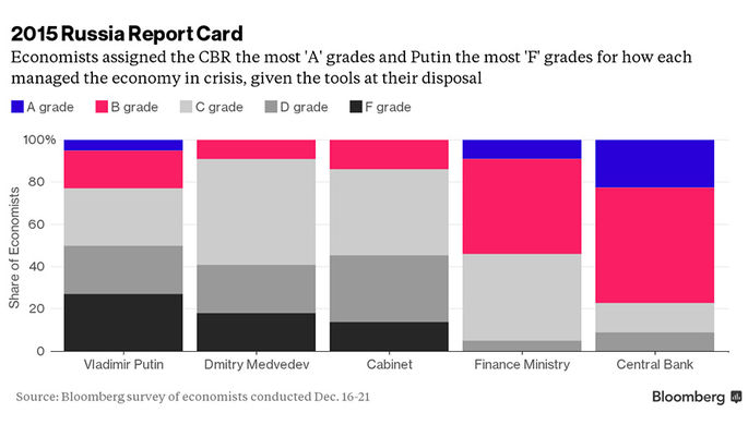 Опрошенные агентством Bloomberg аналитики оценили экономическую работу президента России Владимира Путина, премьер-министра Дмитрия Медведева, правительства России, Минфина и Центробанка.