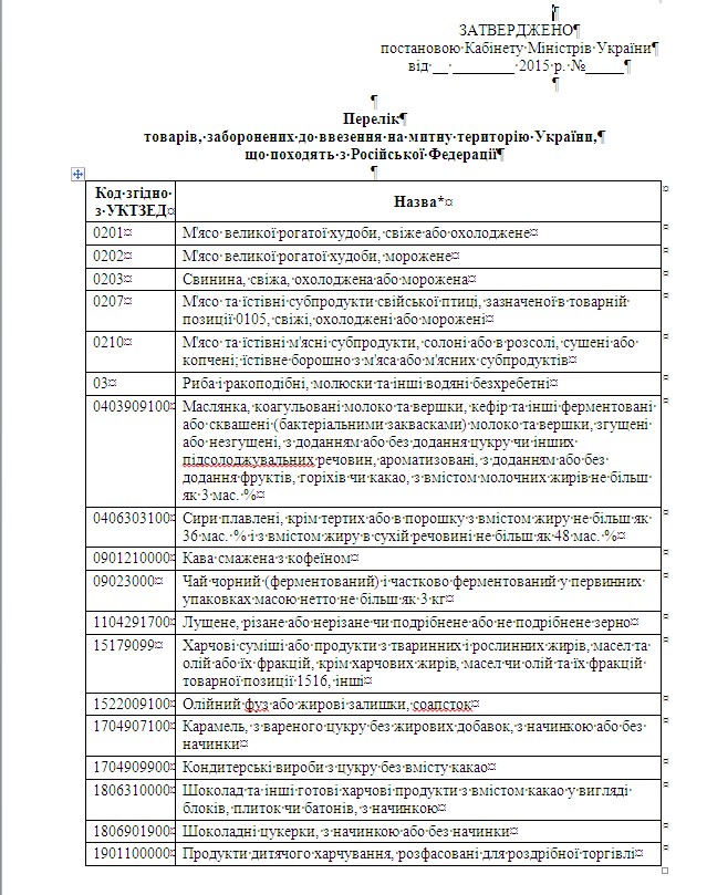 Кабмин утвердил список санкционных товаров из РФ (ДОКУМЕНТ)