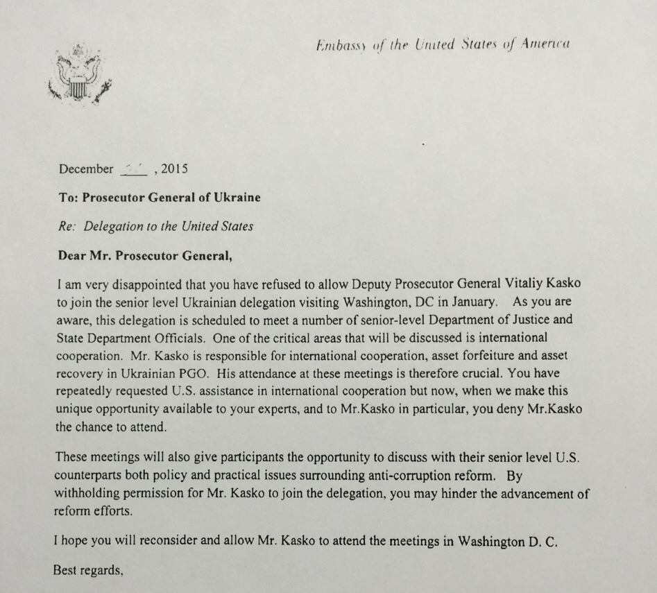В нем выражается надежда, что Шокин пересмотрит решение о возможности участия Касько во встречах в Вашингтоне.