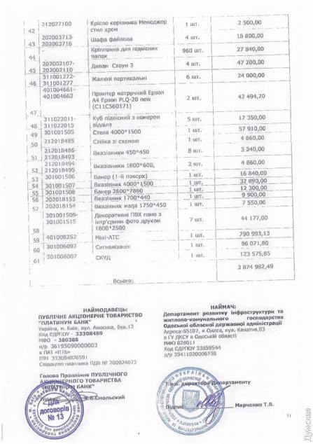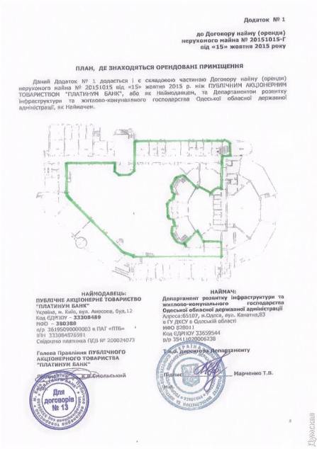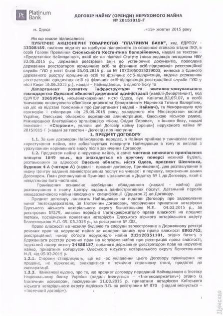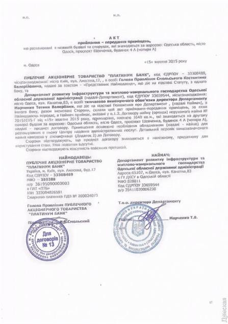 В частности, речь идет об аренде облгосадминистрацией помещения по завышенной в десятки раз цене - директор департамента развития инфраструктуры и ЖКХ Одесской ОГА Марченко подписала договор аренды по ставке 100 долларов / кв.м., тогда как рыночная стоимость аренды аналогичного объекта недвижимости - 135 гривен.