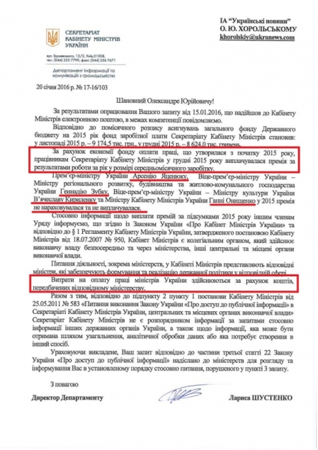 При этом уточняется, что премия «по результатам работы за год» не была начислена четырем сотрудникам - премьер-министру Арсению Яценюку, его заместителям Геннадию Зубко и Вячеславу Кириленко, а также министру Кабинету министров Анне Онищенко. Очевидно, результаты их работы отличаются от результатов работы других сотрудников КМУ.