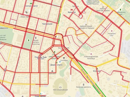 Отметим, что по состоянию на 16:30, красным цветом на карте города обозначен высокий уровень пробок в основном в центре Киева, в том числе в районе Бульвара Шевченко, Институтской, Большой Житомирской, Льва Толстого, Бассейной, в районе старого Подола и других.