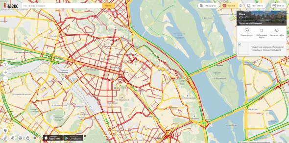 В Киеве автомобильные заторы парализовали движение в центральной части города. Об этом свидетельствуют данные сервиса «Яндекс. Карты».
