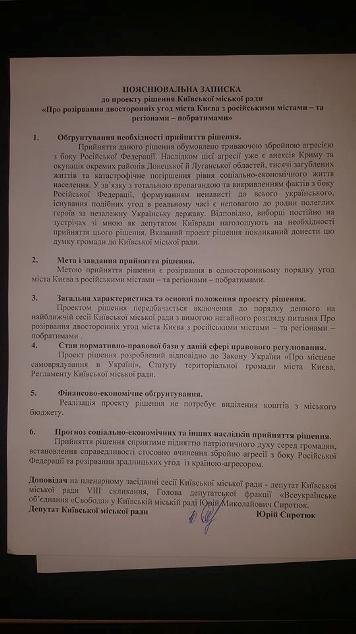 Фракция ВО «Свобода» в Киевсовете вносит проект решения о безотлагательном расторжении двусторонних соглашений о «побратимских отношениях» Киева с российскими городами и регионами.