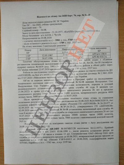 «Простіше кажучи, двигун був зношений, а його експлуатація була ризикованою справою. У червні було проведено плановий огляд двигуна з метою чергового продовження ресурсу. У червні 2020 го року згідно з листом УЕР / 9–01013 від 24.06.2020, ресурс двигуна Ан–26 з бортовим номером 76 був продовжений фахівцями заводу «Мотор Січ» до 5 червня 2021–го року і 2550 льотних годин. Тобто на 800 годин більше, ніж було покладено до документам з експлуатації в СРСР! Чому замість капремонту двигуна продовжили ресурс?