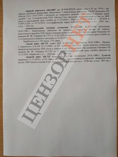 Головний редактор видання «Цензор» Юрій Бутусов оприлюднив документи про стан літака, що розбився поблизу Чугуєва, Харківської області.