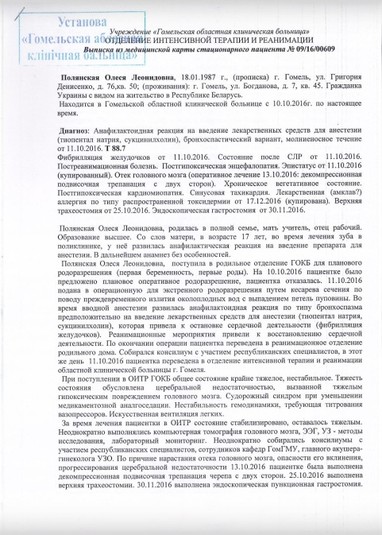 «Ми не знаємо точно, які медикаменти вводив Олесі анестезіолог. Нам усієї правди не говорять. У той день через реакцію на препарат у неї почався набряк і двічі зупинялося серце. Вона не дихала до семи хвилин. Лікарям удалося її повернути, але до сьогодні Олеся перебуває в комі. Її син Ілля також пережив кисневе голодування і досить довго відновлювався. Для нього найскладніше вже позаду. Хоч він ще не почав ходити, лікарі кажуть, з ним усе буде добре. Зараз він живе з бабусею в Гомелі», – повідомила Ткаченко.