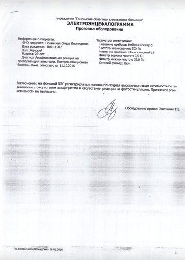 Олеся Полянська під час пологів через анафілактичний шок після анестезії пережила зупинку серця і впала в кому. Лікарі в Україні, Росії та Білорусі відмовилися від пацієнтки. Тільки польський професор-реабілітолог Ян Талар вважає, що дівчину можна повернути до нормального життя. На підготовку до реабілітації та три місяці перебування на лікуванні в Польщі потрібно зібрати понад 440 тис. грн, розповіла виданню «Гордон» родичка Полянської Тетяна Ткаченко. Родина звертається з проханням про допомогу до всіх небайдужих людей.
