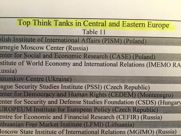 В десятку лучших аналитических центров мира входят организации из США, Британии и Бельгии. В Центральной и Восточной Европе лучшим аналитическим центром признан Польский институт международных дел.