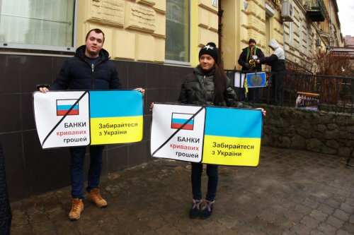 Активисты также развернули плакаты с призывами к российским банкам «убираться из Украины».