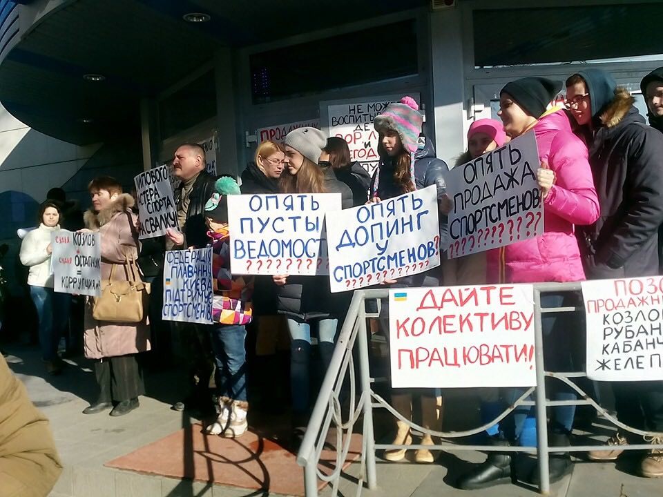 Сегодня возле киевского бассейна ШВСМ (Юность) проходит мирная акция протеста родителей, спортсменов, тренеров и работников бассейна против восстановления бывшего директора Олега Гатченко в должности.