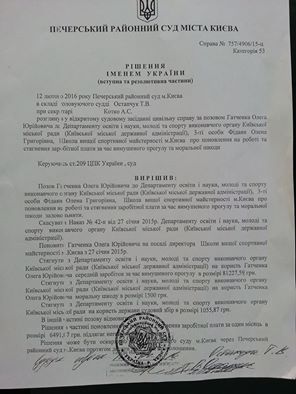 Ранее Главком сообщал, что приказом Департамента образования и науки, молодежи и спорта Киевской городской государственной администрации от 27 января 2015 года был освобожден директор Школы высшего спортивного мастерства Киева Олег Гатченко в связи с установлением факта использования им фальшивого удостоверения «Мастер спорта СССР». Кроме того, аудиторская проверка Департамента внутреннего финансового контроля и аудита КГГА выявила финансовые нарушения в данном учебном заведении на общую сумму почти 2,5 млн грн.
