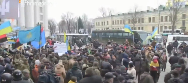 Участие в "флэш-мобе" принимали активисты из батальона ОУН, раздавались крики "Ахмєтова-собаку повісить на гілляку", "Восток и Запад вместе", "Революция".