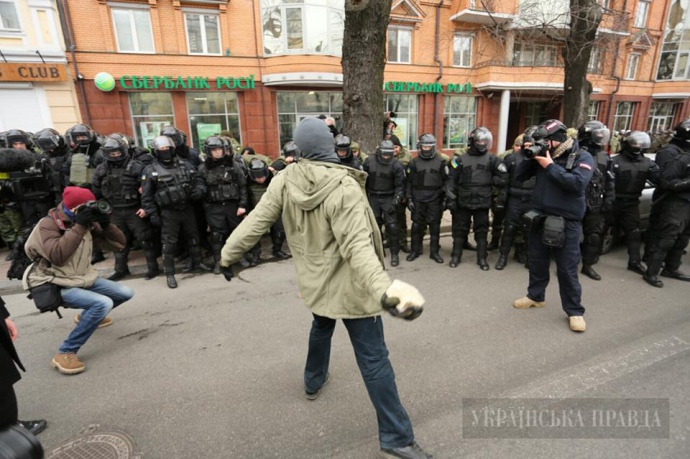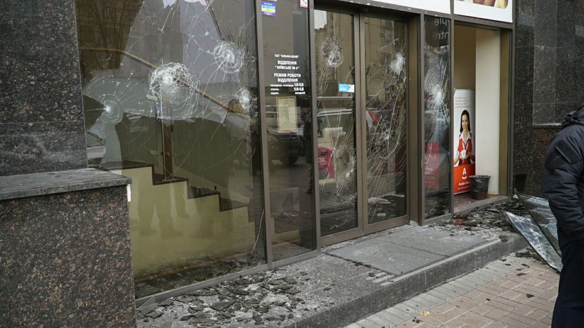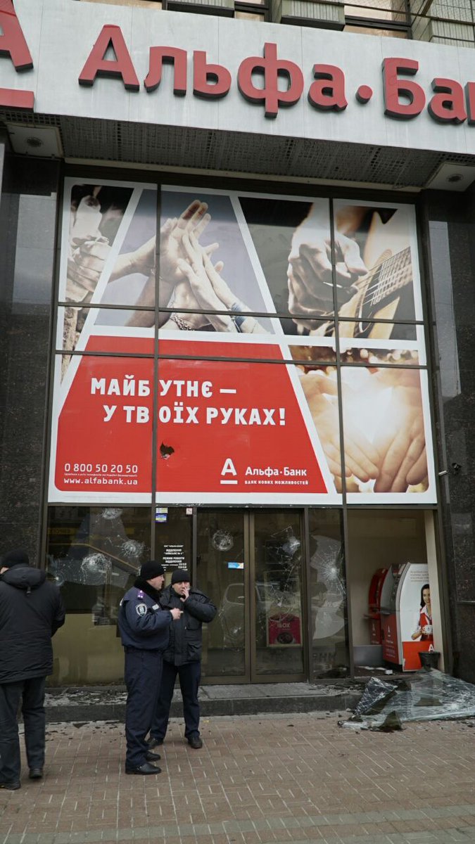 Кроме того активисты забросали камнями офис "Альфа-Банка" на ул. Крещатик.