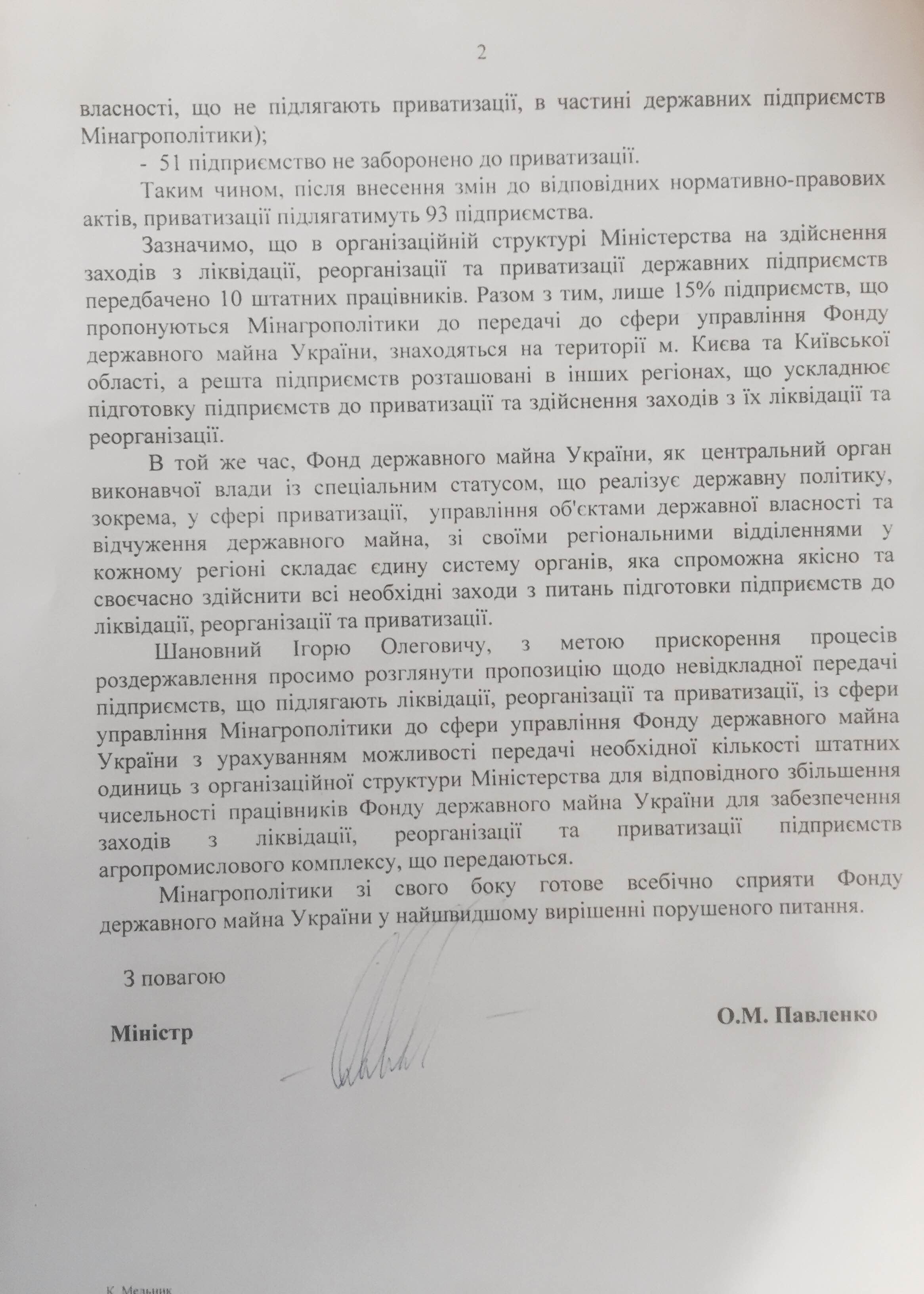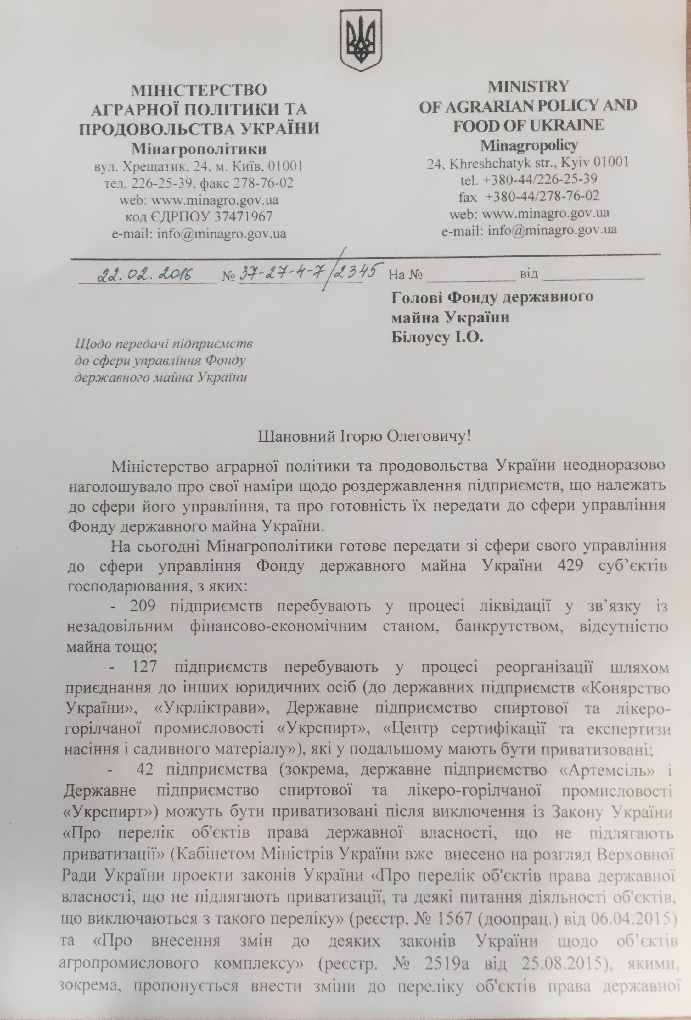 В письме также отмечается, что для обеспечения мероприятий по ликвидации, реорганизации и приватизации предприятий АПК, передача ГП возможна с учетом передачи необходимого количества работников Минагрополитики.