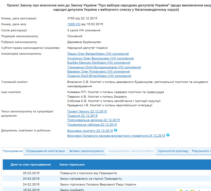 Президент Петр Порошенко подписал закон, согласно которому разрешается исключение кандидатов в депутаты парламента из избирательного списка партии в той его части, где по итогам голосования таковые не получили права на распределение мандатов в многомандатном округе. Об этом говорится на странице соответствующего законопроекта №3700 на сайте Верховной Рады.
