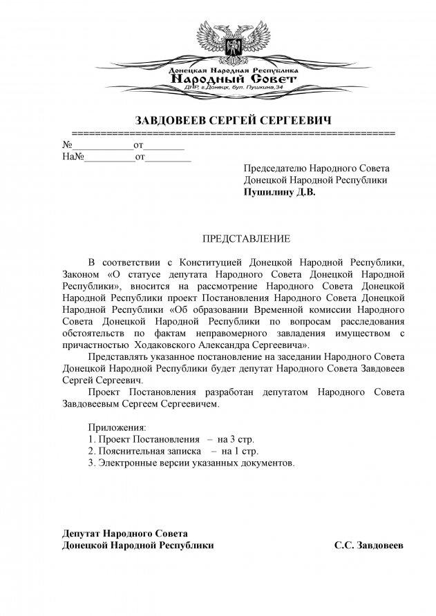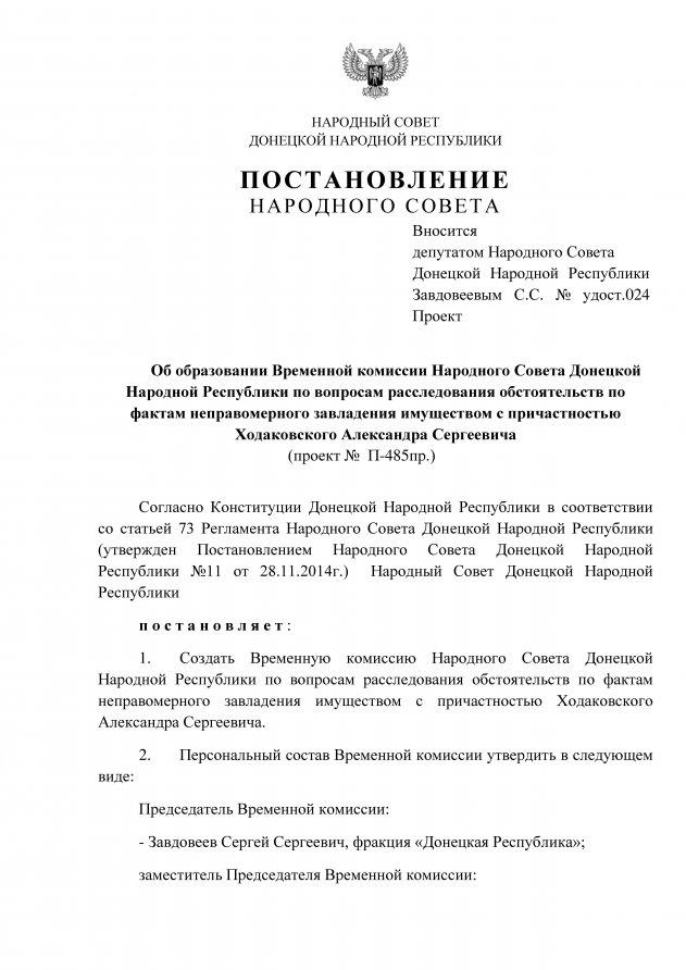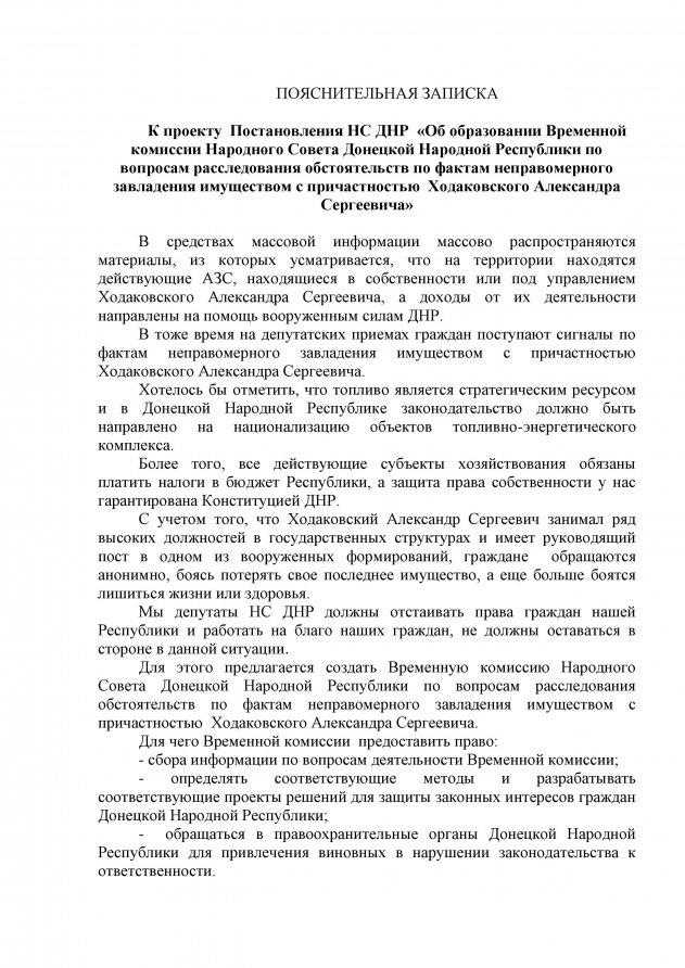 Как сообщает группа «Информационное сопротивление», 25 февраля стало известно о том, что в «народном совете ДНР» планируется создание временной комиссии, которая займется расследованием «темных делишек» Ходаковского. А 27-го числа состоялось заседание «народного совета ДНР», на котором, как сообщил Ходаковский, помимо рассмотрения ряда «законопроектов» было принято «постановление об образовании временной комиссии народного совета ДНР по вопросам расследования обстоятельств по фактам неправомерного завладения имуществом с причастностью Ходаковского Александра Сергеевича».