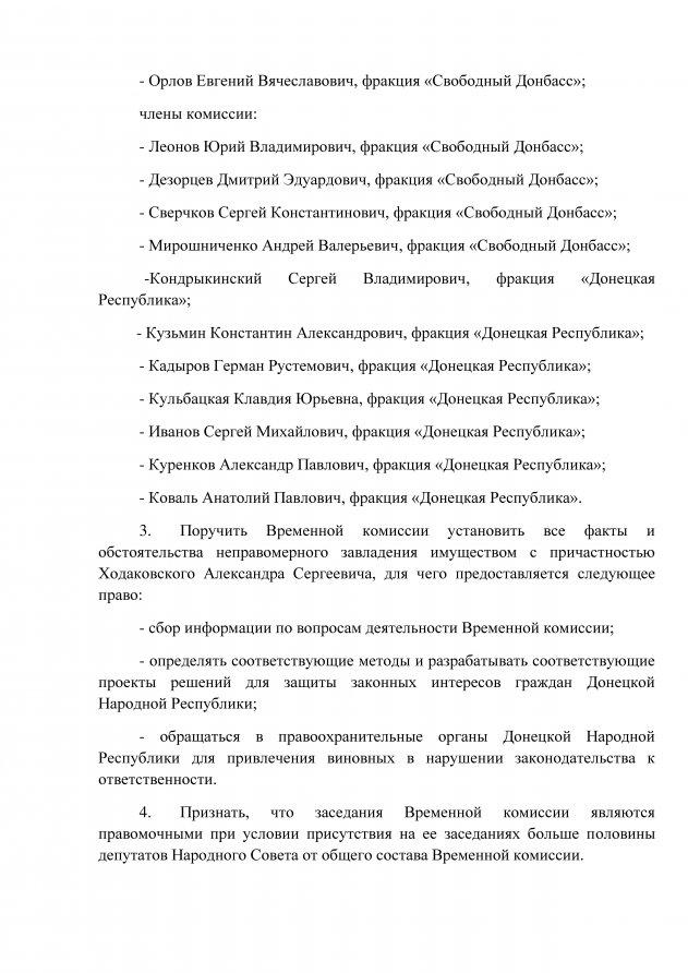 Комиссии среди прочего было поручено установить все факты и обстоятельства неправомерного завладения имуществом с причастностью Ходаковского, для чего ей предоставлено право на обращение в «правоохранительные органы ДНР для привлечения к ответственности виновных в нарушении законодательства». Срок работы комиссии определен до 30 апреля с.г. В «официальных» СМИ «ДНР» относительно создания временной комиссии по Ходаковскому ничего не сообщалось.