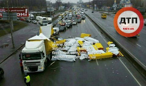 На выезде из Киева произошло ДТП: «рассыпалась» фура (ФОТО)