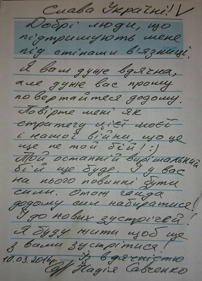 Вера также обнародовала записку от Нади с благодарностью всем, кто ее поддерживает под тюрьмой. «Я вам очень благодарна, но очень вас прошу возвращайтесь домой…. Это еще не тот бой!», - написала, в частности Надежда Савченко.
