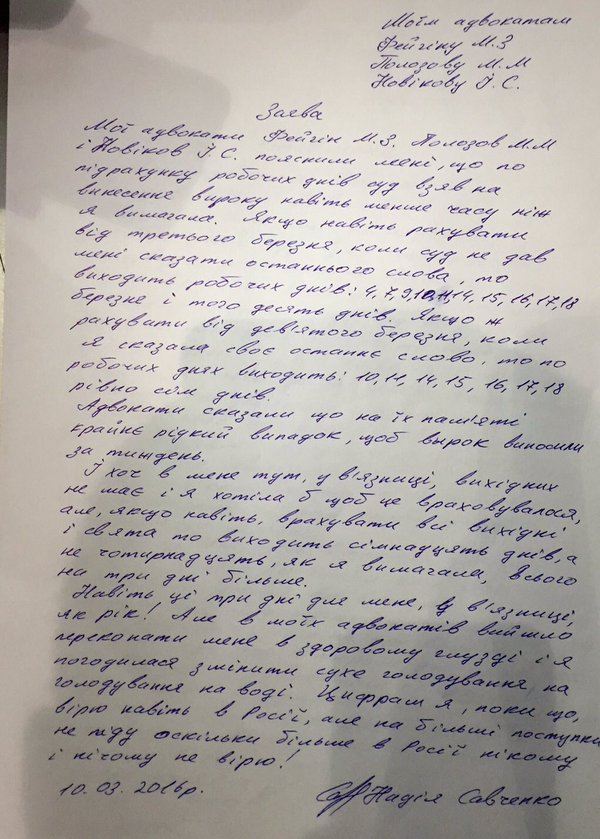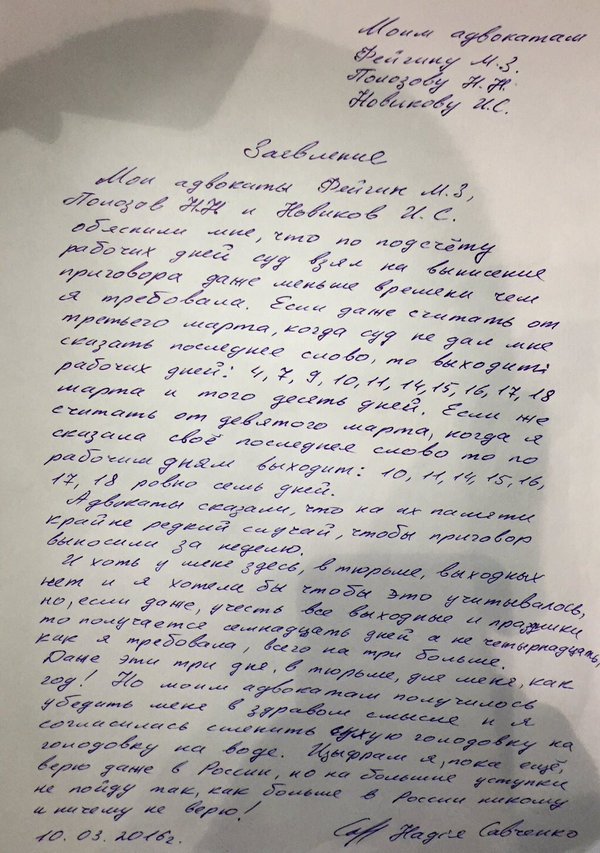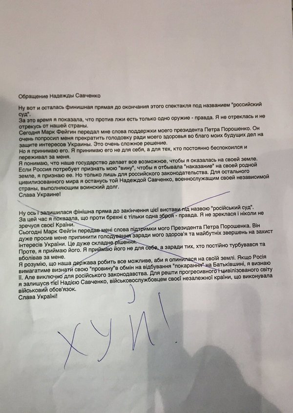 В своих письмах на русском и украинском Савченко объяснила, почему решила отказаться от сухого голодания.