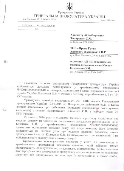 По словам Клименко, следователи Второго следственного отдела управления спецрасследований ГПУ, нарушив установленные законом процедуры, не допустили его адвокатов Татьяну Жуковскую, Елену Клименко и Сергея Титаренко к представлению интересов политика в судах Украины и других правоохранительных ораганах.