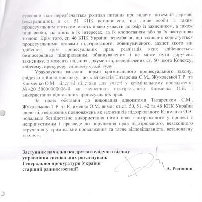 Александр Клименко заявил о лишении его Генеральной прокураторой права на защиту его интересов адвокатами, а также обратил внимание на наличие оснований для привлечения следователей к ответственности.