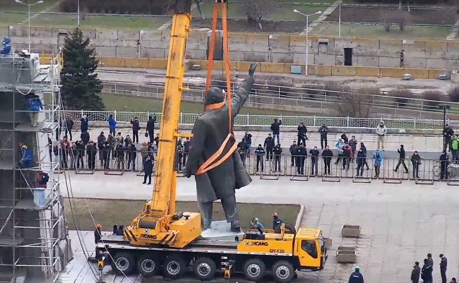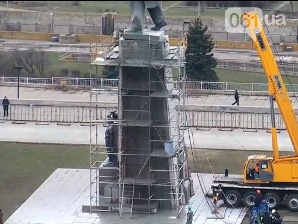 В Запорожье демонтировали самый большой в Украине памятник Ленину. Подготовка к сносу памятника стартовала еще в субботу - тогда памятник оградили забором, в понедельник вокруг него установили строительные леса, во вторник - убрали буквы, вчера весь день проходила активная фаза демонтажа.