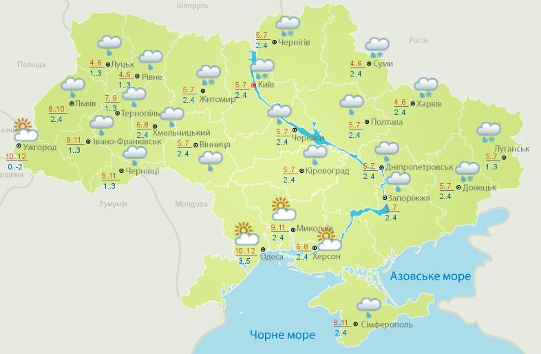 Погода на сегодня: 18 марта 2016 года на западе, в центре Украины и в Крыму ожидаются дожди, на севере и востоке дожди с мокрым снегом, на юге и в Закарпатской области без осадков, температура днем от +4 до +12.