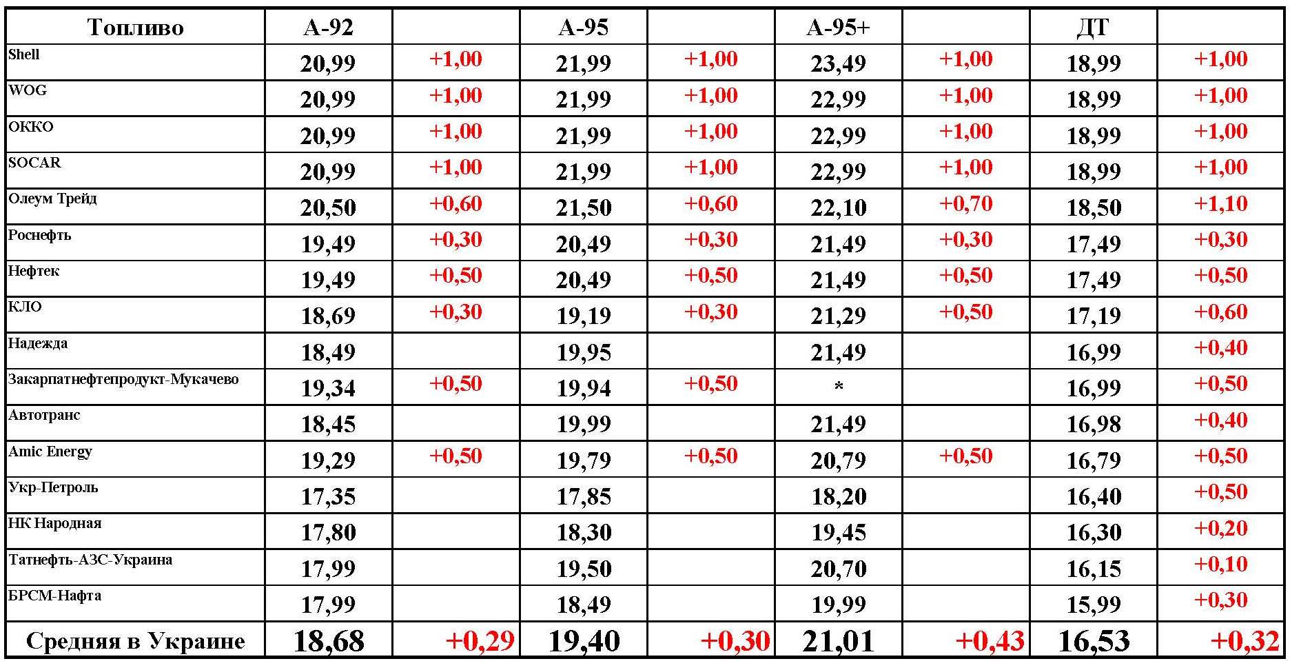Крупные национальные операторы WOG, OKKO, Shell и SOCAR повысили цены на всю линейку топлива на 1 грн/л. На 30 коп./л поднялись цены в сети, которой управляет «Роснефть-Украина».