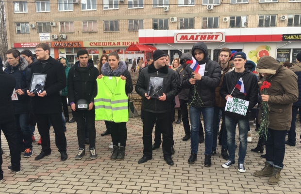 Как передает УНИАН, около 20 молодых людей держат в руках государственные флаги России, красные гвоздики, а также портреты погибших российских журналистов в черных рамках.