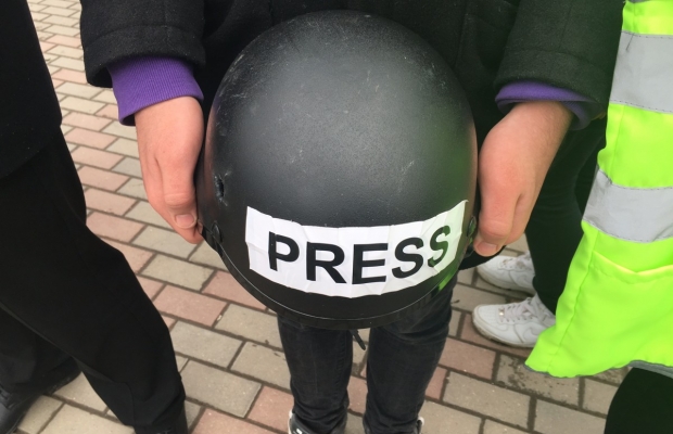 Участники акции также держат в руках жилет и каску с надписью «пресса» (погибшие российские журналисты были без касок и бронежилетов).