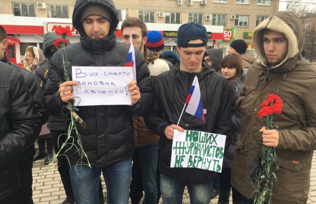 Собравшиеся также держат плакаты с надписями: «Савченко должна ответить по закону», «Награды Савченко — награды за зверство», «Савченко причастна к убийству российских журналистов», «В их смерти виновна Савченко».