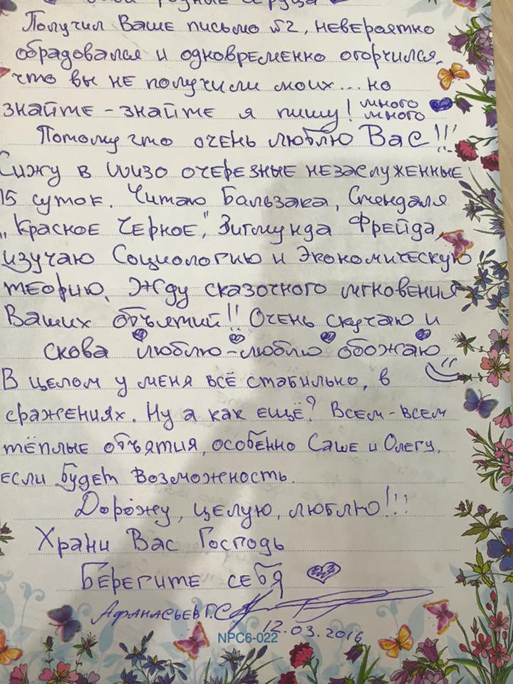 Также Афанасьев сообщил в письме, что сфотографировали его татуировки и отправили на экспертизу». «Говорят, что я нацист, хотят штрафовать… Эта Россия)))…», - написал он.