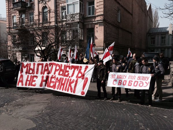Под посольством Беларуси в Киеве проходит акция в поддержку белорусов, которые воюют на Донбассе в поддержку территориальной целостности Украины.