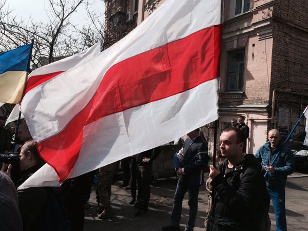 Они также держат украинский и бело-красно-белый флаг Беларуси.